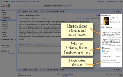 Enlaza las cuentas de mail de tus contactos con sus perfiles en Twitter, Facebook, Linkedin y Skype Lo que hace esta aplicación una vez instalada en nuestro navegador web es permitirnos saber información acerca de la persona que se encuentra detrás del email que acabamos de recibir. Automáticamente cruza el email con las redes sociales para ofrecernos información sobre sus perfiles de Social Media.